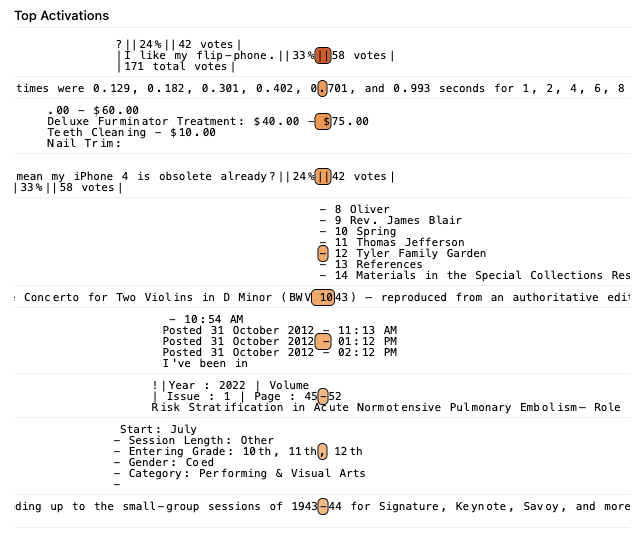 The max-activating examples for this feature show consistent activation on tokens immediately preceding numbers under 31, which aligns well with the heatmap's preference for promoting smaller numerical values. However, the examples don't demonstrate the same strict input dependence observed in the attribution heatmap, suggesting the feature may have broader activation patterns in natural text than its task-specific behavior would predict. Interestingly, the feature appears to activate in diverse contexts including academic citations, legal documents, and technical specifications, indicating it may serve as a general detector for "small number contexts".
